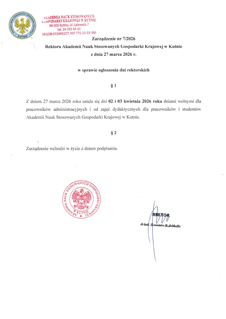 informujemy, że zgodnie z decyzją JM Rektor dni 2 i 3 kwietnia 2026 roku są dniami wolnymi od zajęć dydaktycznych.