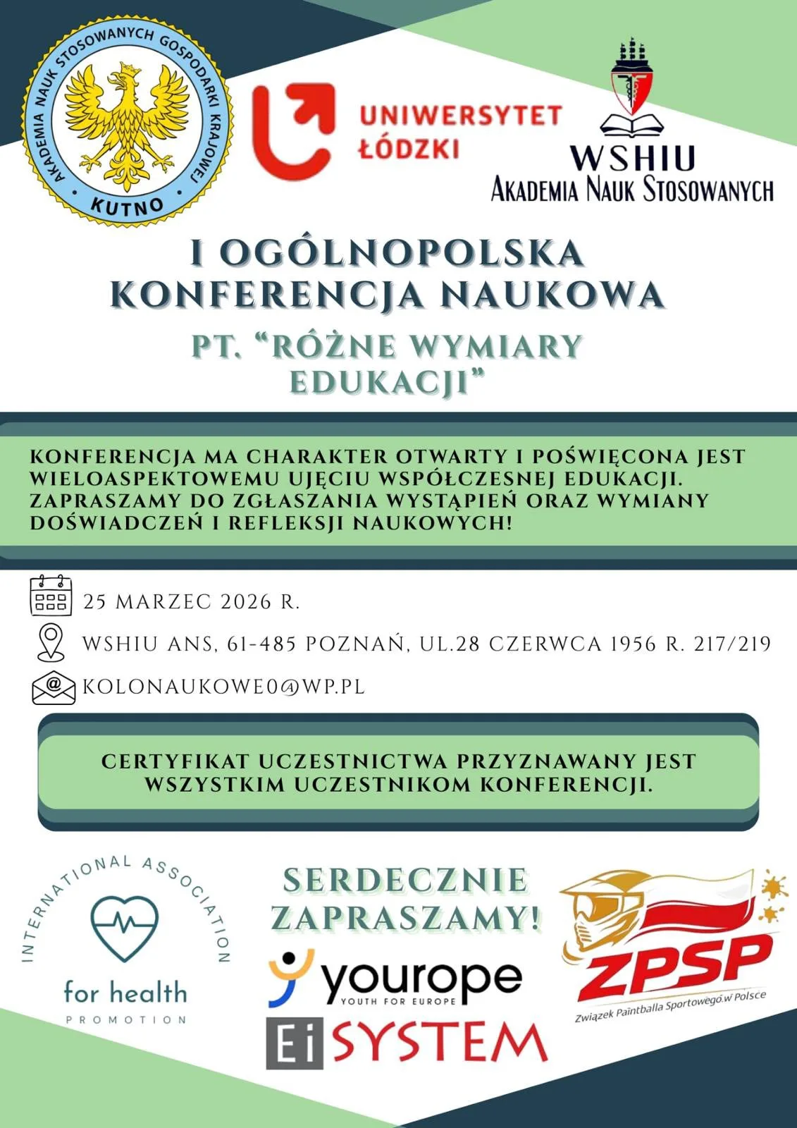 Z inicjatywy Koła Naukowego Psychologiczno-Pedagogicznego Akademii Nauk Stosowanych Gospodarki Krajowej w Kutnie we współpracy z programem yourope Youth for Europe – Horyzont Europa, oraz studentami WSHIU w Poznaniu odbyła się I OGÓLNOPOLSKA KONFERENCJA NAUKOWA pt: RÓŻNE WYMIARY EDUKACJI.