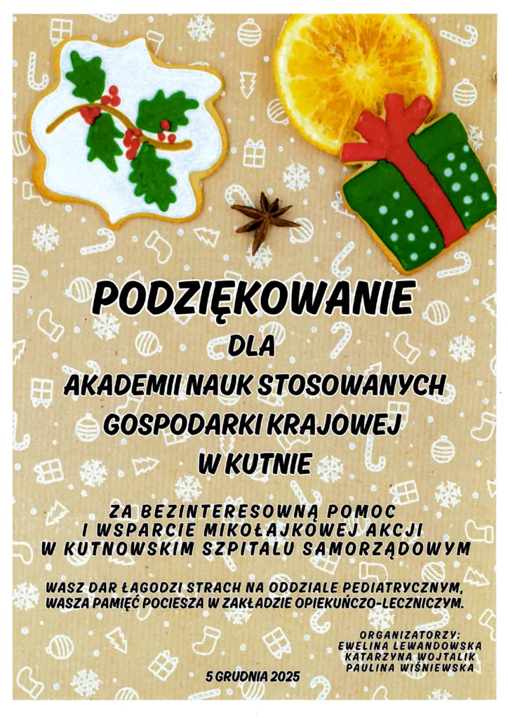Z ogromną radością i wzruszeniem informujemy, że nasza Uczelnia miała zaszczyt uczestniczyć w wyjątkowej akcji charytatywnej zorganizowanej z okazji Mikołajek. Dnia 5 grudnia 2025 roku społeczność Akademii Nauk Stosowanych Gospodarki Krajowej w Kutnie włączyła się w pomoc dla pacjentów Kutnowskiego Szpitala Samorządowego.