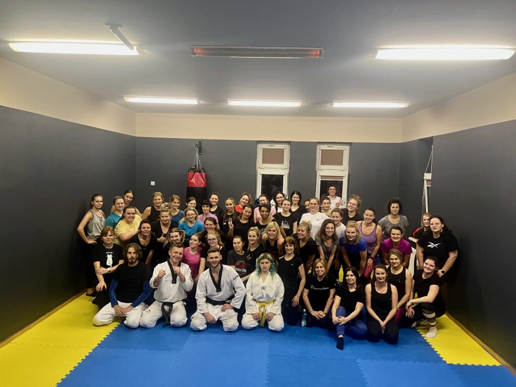 Zajęcia prowadzili Tomasz Białobłocki i Bartek Kowalewski przy wsparciu asystentów i asystentek z sekcji Taekwondo. Przerabialiśmy techniki walki w parterze, kopnięcia, uderzenia, obronę przed duszeniem workiem foliowym, obronę przed nożownikiem i wiele innych rzeczy.
