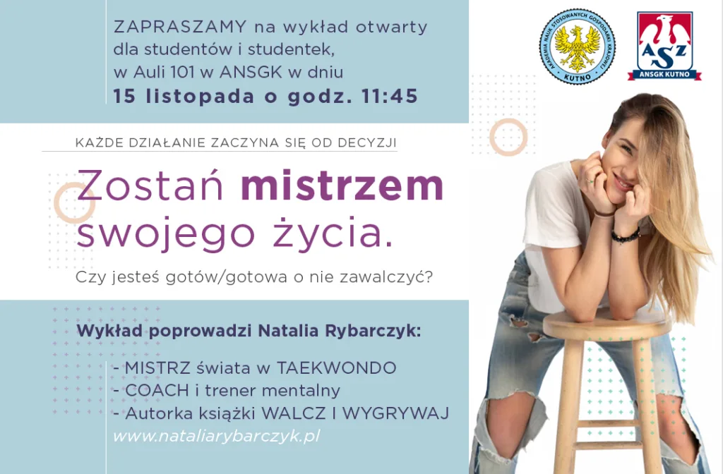 Już 15 listopada o godz. 11:45 w Auli 101 ANSGK odbędzie się otwarty wykład motywacyjny „Zostań mistrzem swojego życia”. Spotkanie poprowadzi Natalia Rybarczyk – mistrzyni świata w taekwondo, coach i trener mentalny, autorka książki „Walcz i wygrywaj”. To wyjątkowa okazja, by poznać sekrety skutecznego działania, motywacji i odwagi w dążeniu do własnych celów. Czy jesteś gotów, by zawalczyć o swoje życie?