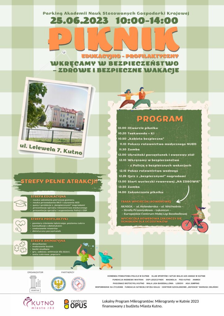 Piknik edukacyjno-profilaktyczny „WKRĘCAMY W BEZPIECZEŃSTWO – ZDROWE i BEZPIECZNE WAKACJE odbędzie się 25.06.2023 r. (niedziela) w godz. 10.00 – 14.00 przy ul. Lelewela 7 (parking Akademii Nauk Stosowanych Gospodarki Krajowej w Kutnie).